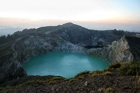 Kelimutu est généralement recouvert d’un épais brouillard. Les voyageurs, cependant, se rendent très tôt le matin pour attraper le lever du soleil lorsque le brouillard se dissipe au lever du soleil.